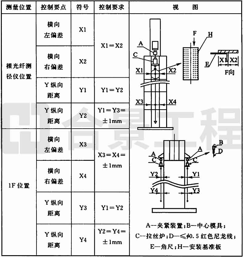 8.8.1 拉絲塔架垂直度調整可用直徑不大于0.5mm紅色尼龍繩穿過拉絲爐的中心模具,再放到塔架底端掛上鉛錘后浸入油杯中進行檢查及調整。雙面光纖拉絲塔塔架的垂直度應符合本規范表9.3.1的要求,單面光纖拉絲塔塔架的垂直度應符合本規范表9.3.2的要求。